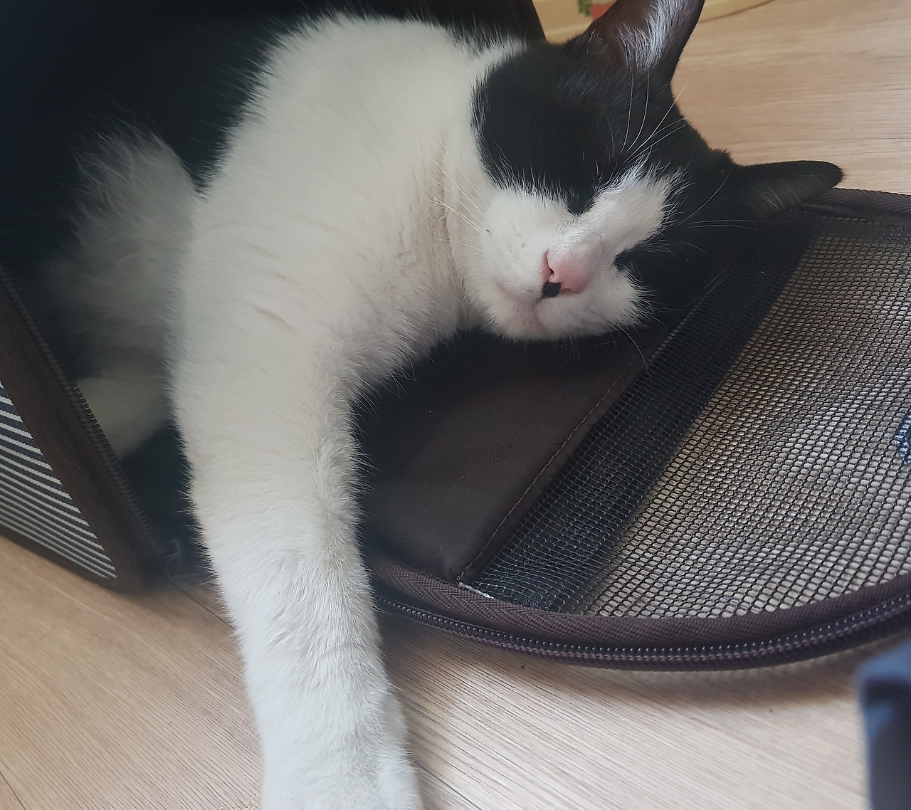 망고도 처음엔 가까이 다가오는 깜지한테 하악질을 한 두번 했는데, 두번째 만남에는 자기 이동장에서 자고 있는 깜지를 가만히 바라만 봤다.