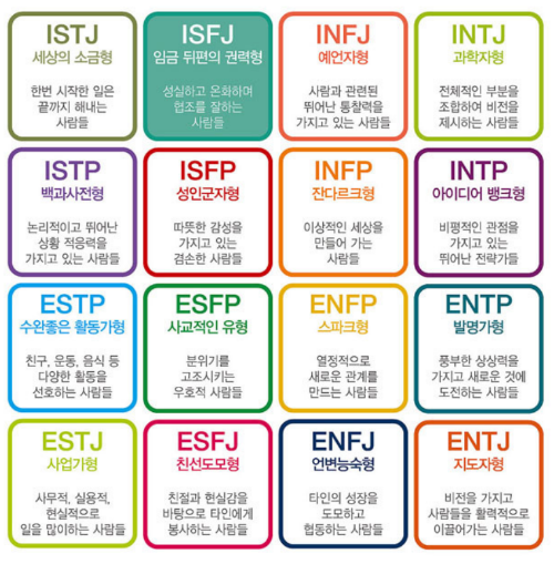 ISTJ, ISFJ, INFJ, INTJ, ISTP, ISFP, INFP, INTP, ESTP, ESFP, ENFP, ENTP, ESTJ, ESFJ, ENFJ, ENTJ 16가지의 성격유형이 된다.