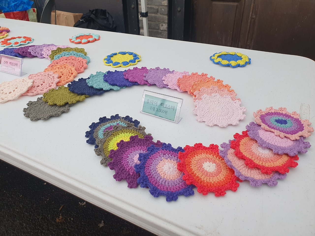 이번 플리마켓은 수제품과 기성품 그 무엇이든 판매해도 무방한 듯하다. 아무리 번화가라고 해도 책에 관심 있는 사람이 얼마나 있을지는 그 누구도 예상할 수 없다. 길거리를 지나치는 사람들의 눈길을 사로잡기엔 아기자기하고 블링블링한 소품이 제격이다. 내가 뜬 귀여운 컵 받침이 누군가의 손에 들려 가기를 기대하며 이태원으로 갔다.