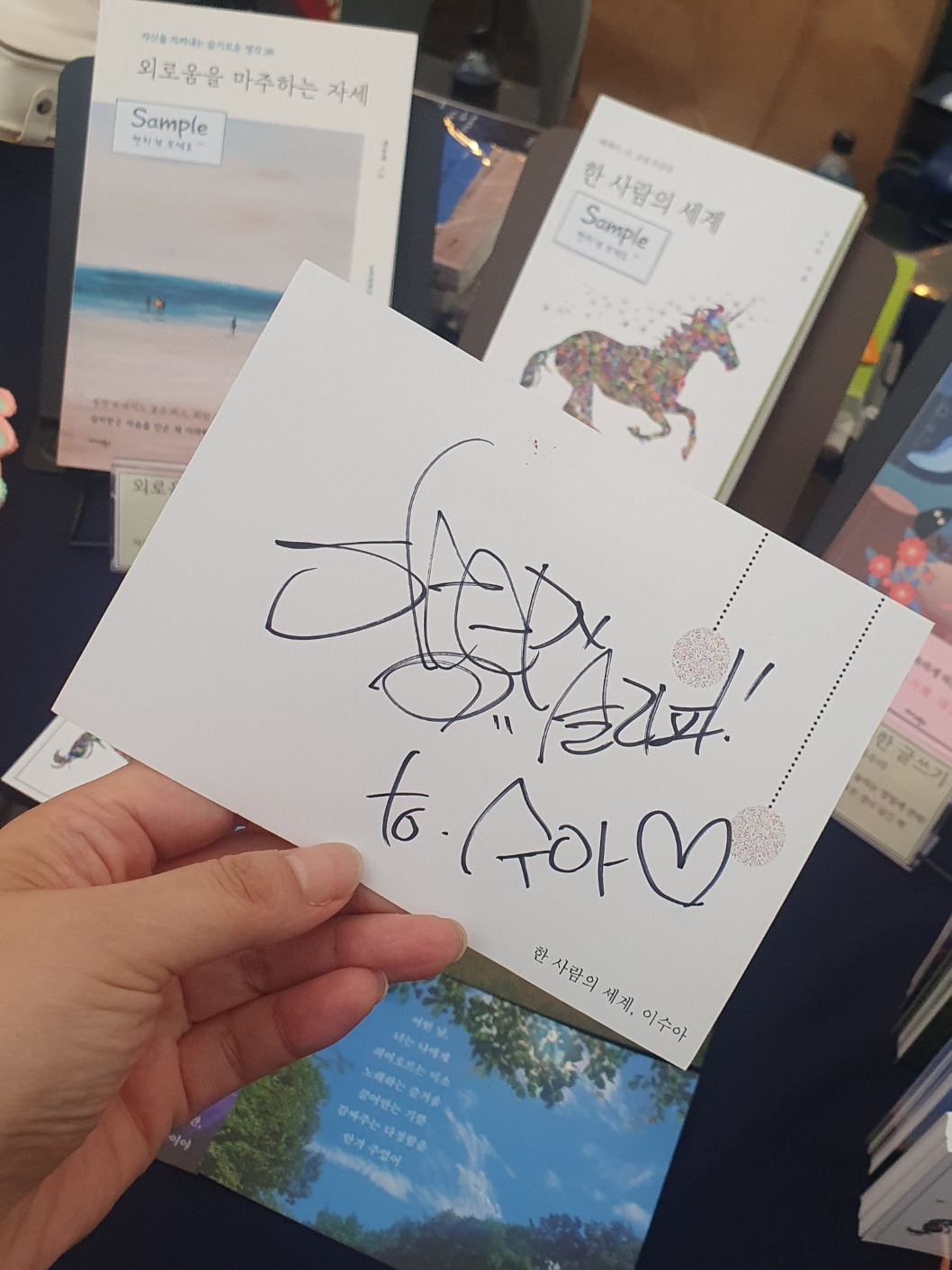 함께 간 L은 배우이자 모델이라고 했다. 검색해 보니 5만 팔로워를 보유한 인플러언서였다. 맙소사 연예인이랑 같이 플리마켓에 나오다니. 이게 무슨 일이람. 연예인답게 팬 분들이 L을 찾아왔다. 세어보진 않았지만, 10명 내. 외였던 것 같다. 어쩐지 하나같이 오자마자 책을 펼쳐 보지도 않고 “이거 주세요!”,라고 말하는 게 심상치 않아 보였다.