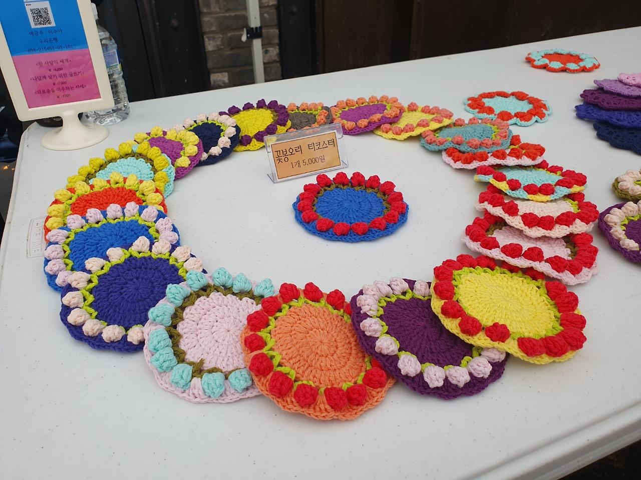 액세서리를 판매하는 어느 셀러가 이태원 상권에 대해 귀띔했다. 참사 이후 상권이 죽어서 사람이 많지 않은 것 같다고 말이다. 그러고 보니 어느 호프집에서는 호객행위를 하기도 했다. 생각했던 것보다 컵 받침에 관심 가져준 분이 많았다. “어떻게 만들었어요? 너무 예뻐요”, “솜씨가 장난이 아니네요.”, “손으로 만들었는데도 파는 것처럼 해 놓아서 보기 좋네요.”, “튤립 봉오리가 정말 귀여워요.”, 하는 칭찬 세례도 받았다. 그 칭찬들이 다 판매로 이어지진 않았지만, 마음만은 풍요로웠다.