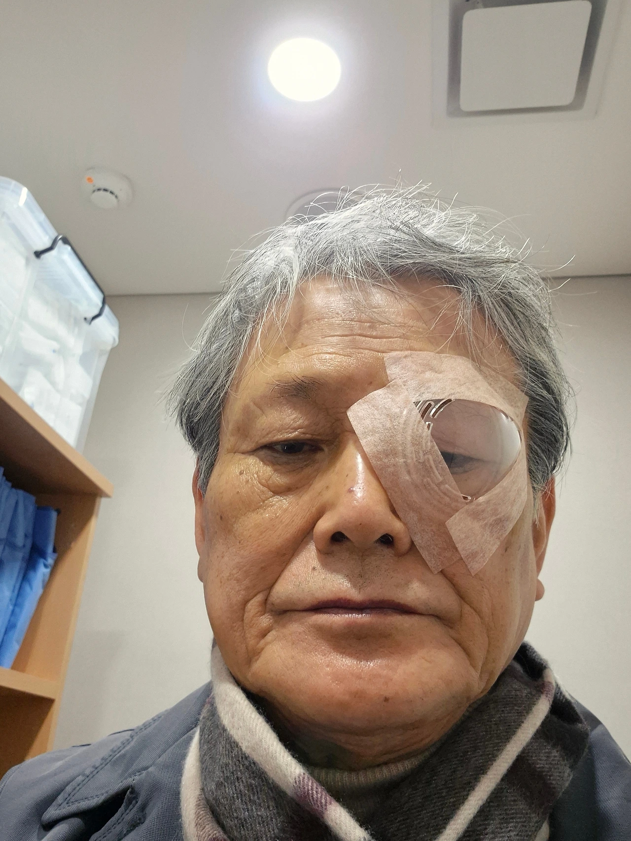 남자 간호선생의 부축을 받으며 탈의실로 왔다. 눈에는 안대를 씌웠다. 집에 갈 때까지 쓰고 있으란다. 오늘은 세수도 하지 말란다. 안약만 넣으라고 했다. 눈동자에 까만 점이 계속 돌아다닌다. 편의점에서 마스크와 물 한 병을 샀다.