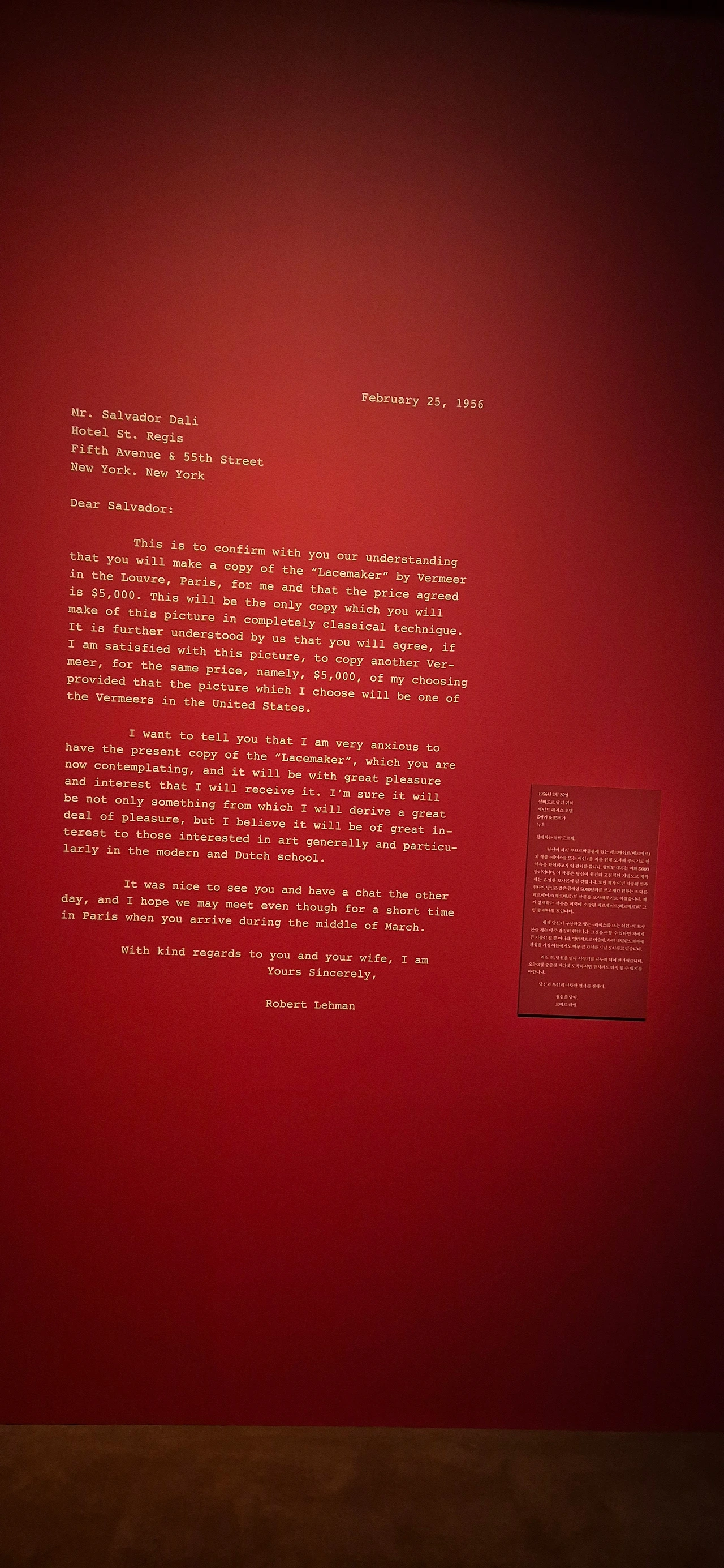 "리먼 가문은 미술사에서 중요한 대가들의 작품을 수집하는 것을 매우 중요하게 생각했습니다. 그러나 페르메이르는 그들이 수집하지 못한 화가 중하나였습니다. 리먼은 달리가 페르메이르 작품의 복제품이 걸린 집에서 자란 것을 알고 리먼 컬렉션의 빈자리를 채우고자 의뢰했습니다. 로버트 리먼은 아버지 필립 리먼과 함께 수집에 대한 열정을 멈추지 않았습니다. 한 미국 수집가의 개성 있는 취향이 반영된 소장품에는 19세기 중반부터 20세기까지 프랑스에서 활동했던 화가들이 만든 생동감 있고 다양한 예술 세계가 담겨 있습니다."