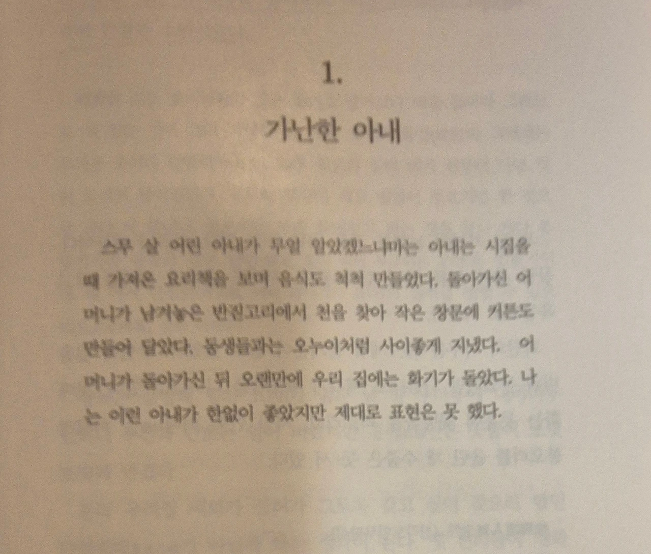 "내가 스물셋에 결혼한 일을 두고 이제 와서 잘잘못을 따지는 일은 무의미하다. 개인의 선택은 언제나 시대와 성향을 따르기 때문이다. 그러나 그 선택에는 '미망인'이라는 조항 은 없었다. 그것은 분명 함정이었다. 계약 위반이었다. 놀라운 음모였다. 우리 둘 중 아무도 그 일을 예견했던 사람은 없었다. 속수무책이었다.….