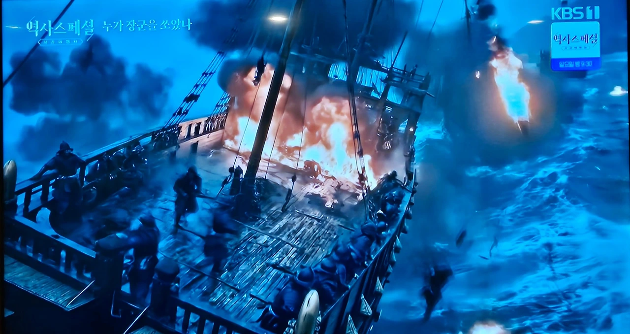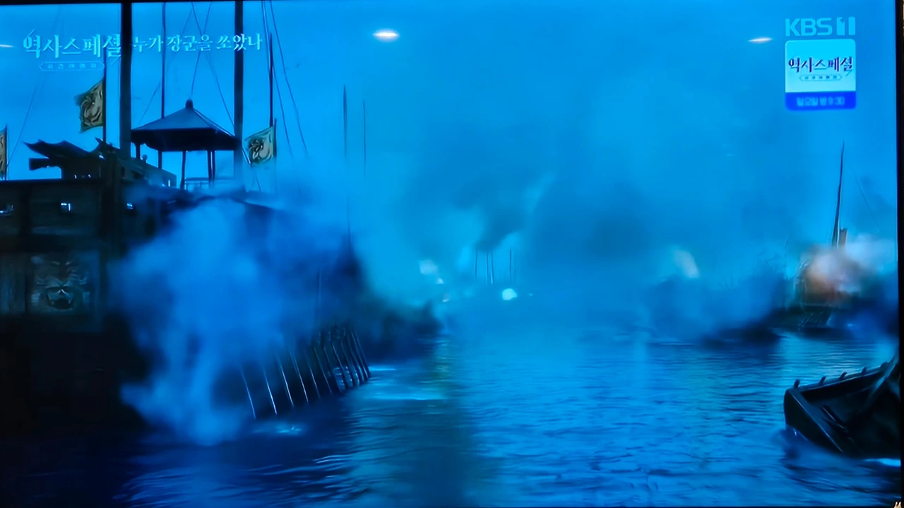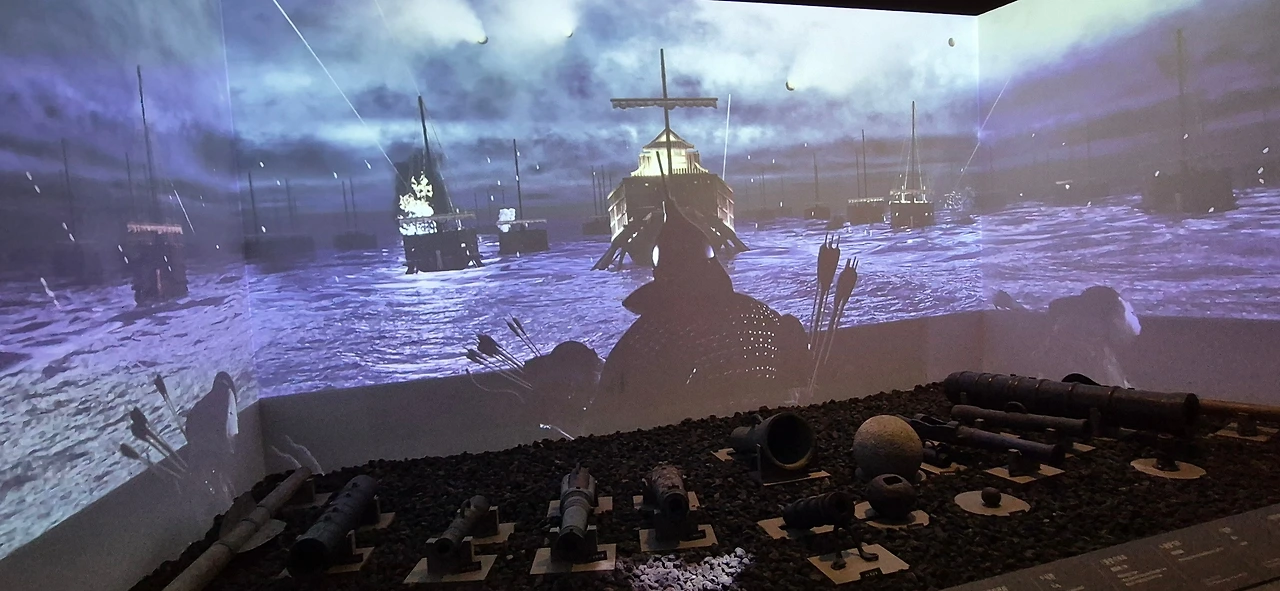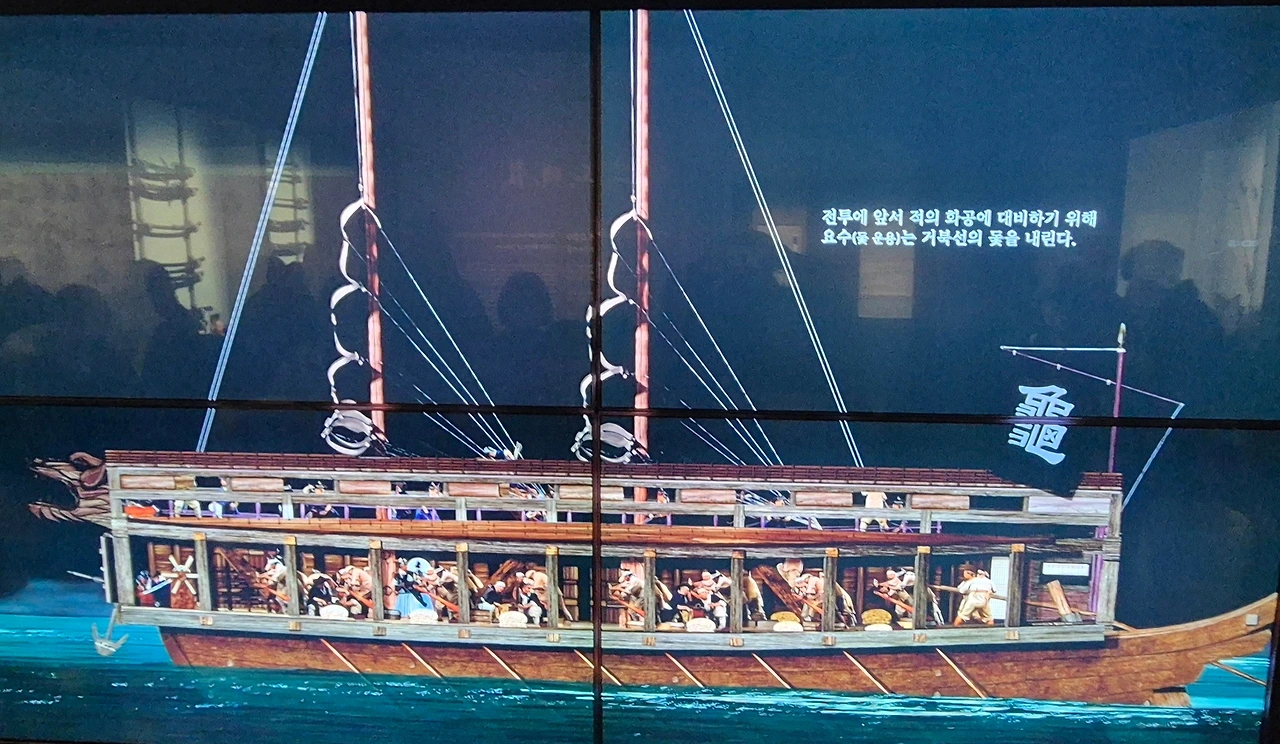 칠흑 같은 어둠 속에 파도가 넘실댄다. 멀리서 거북선을 앞세우고 조선 수군의 함대가 다가온다. 나는 파도 속 바다 영상 한가운데 멈춰 섰다.