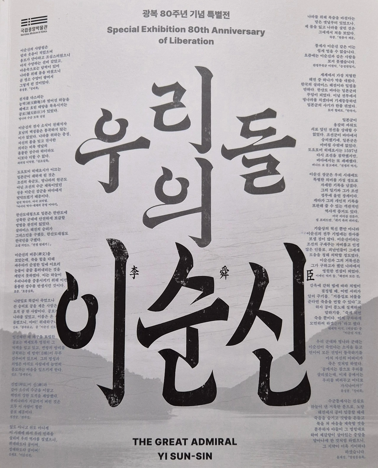 국립중앙박물관은 이순신 장군 탄신 480주년과 광복 80주년을 기념하여 <우리들의 이순신> 전시를 마련하였다. 일본의 기습적인 침략으로 임진왜란이라는 큰 위기를 극복할 수 있었던 것은 일본 수군과의 전투에서 한산도. 명량. 노량에서 큰 승리를 이끈 이순신 장군이 있었기 때문이었다.