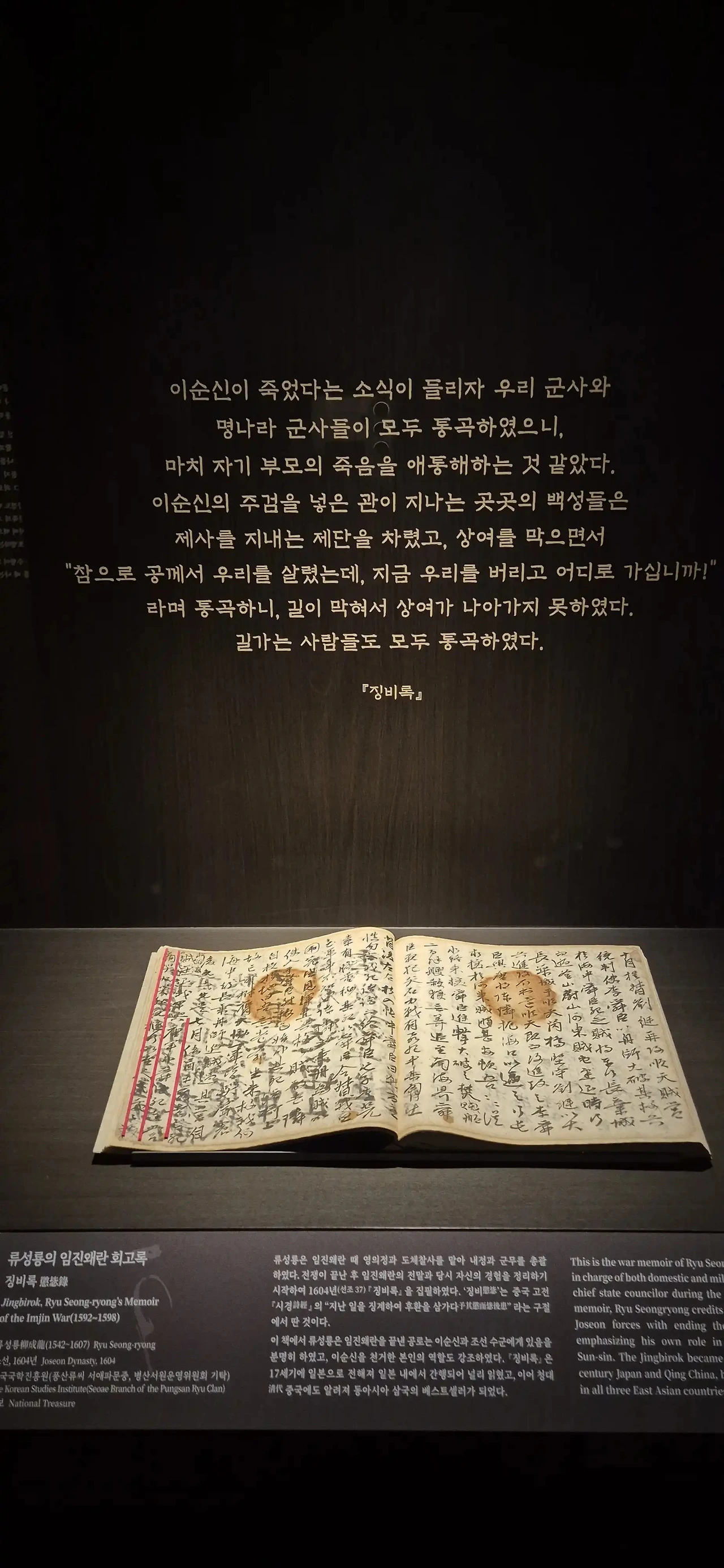 '왕은 이르노라. 어허. 국가가 의지할 바는 오직 수군뿐인데, 흉한 칼날이 다시 번뜩여 마침내 삼 도의 군사를 한번 마음에 모두 잃었으니, 누가 바다 가까운 여러 고을을 지켜주리오. 한산을 이미 잃었으니, 적들이 무엇을 거리리오….'