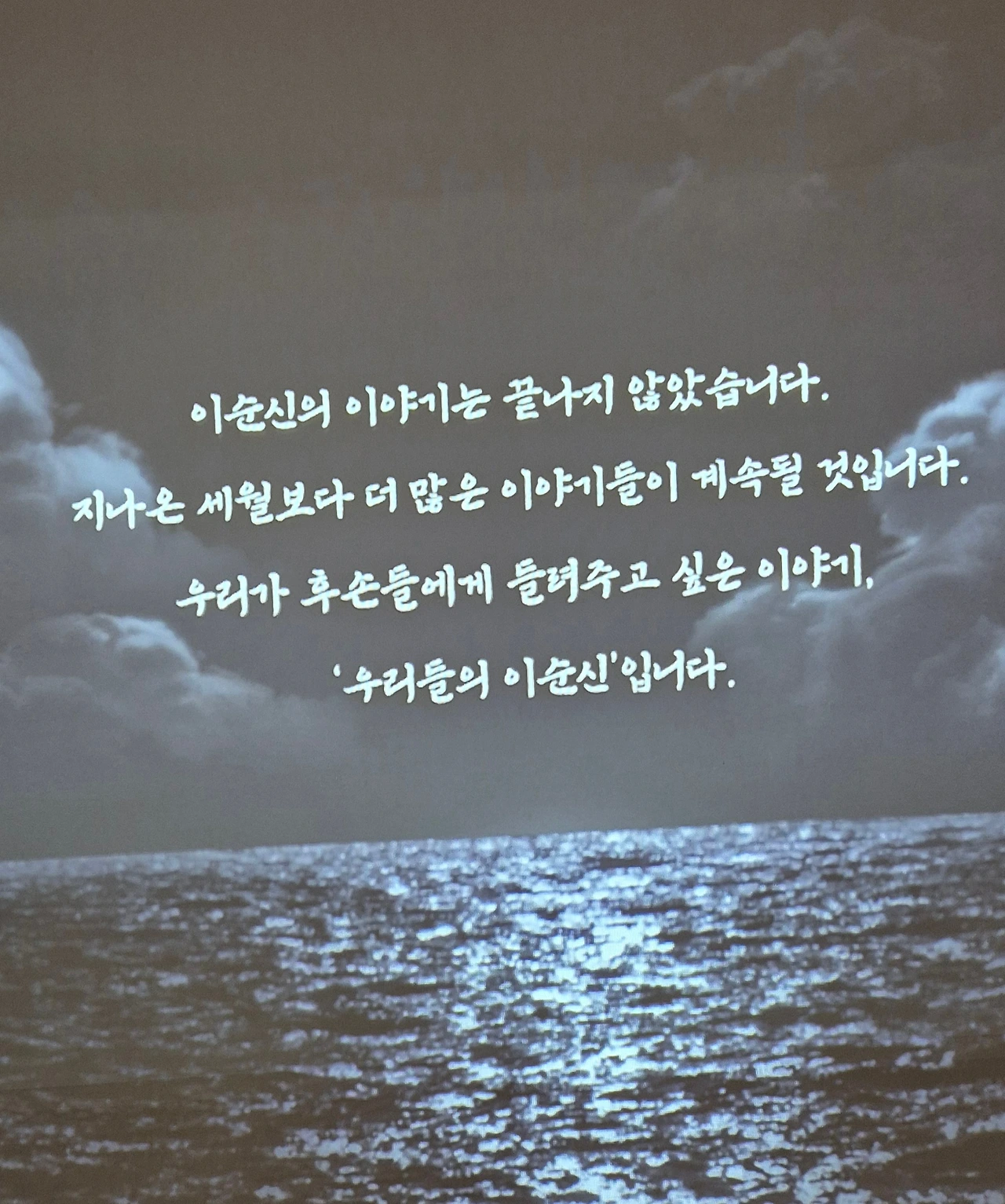 "이순신의 이야기는 끝나지 않았습니다. 지나온 세월보다 더 많은 이야기가 계속될 것입니다. 우리가 후손들에게 물려주고 싶은 이야기, '우리들의 이순신'입니다. “