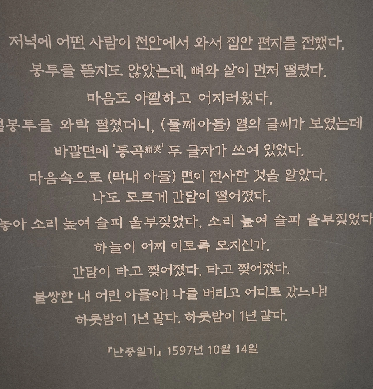 난중일기 중에서 가장 감동적인 문장이다. 막내아들 면이 왜군과 맞서 싸우다 죽었다는 서찰을 받고 이순신은 소금 굽는 강막지의 집에 가서 목 놓아 통곡했다.