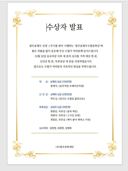제1회 범우윤형두수필문학상 독후감상