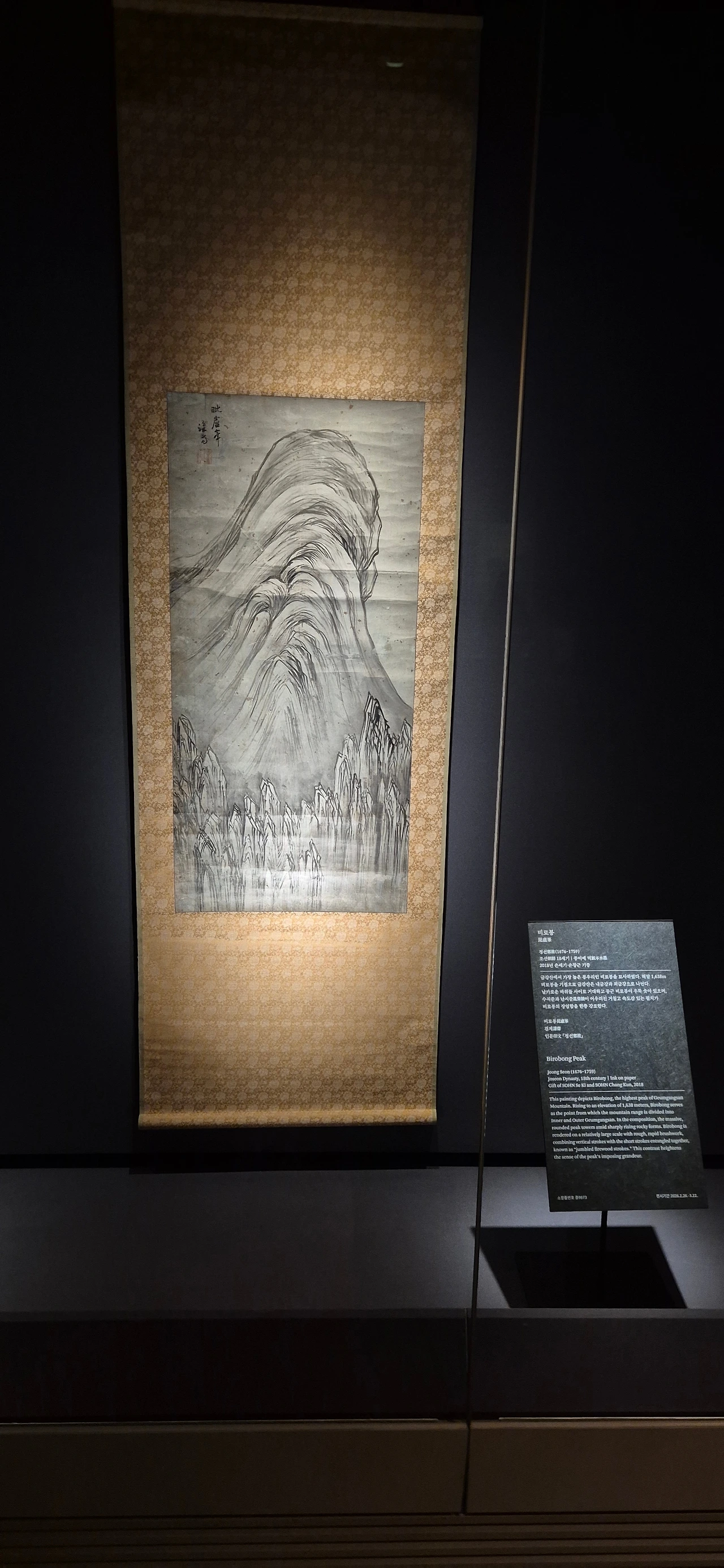 금강산에서 가장 높은 봉우리인 비로봉을 묘사하였다. 해발 1,638m 금강산은 내금강과 외금강으로 나뉜다. 날카로운 바위들 사이로 거대하고 둥근 비로봉이 우뚝 솟아 있으며, 수직준과 난시준이 어우러진 거친 속도감 있는 필치가 비로봉의 장엄함을 한층 강조한다.
