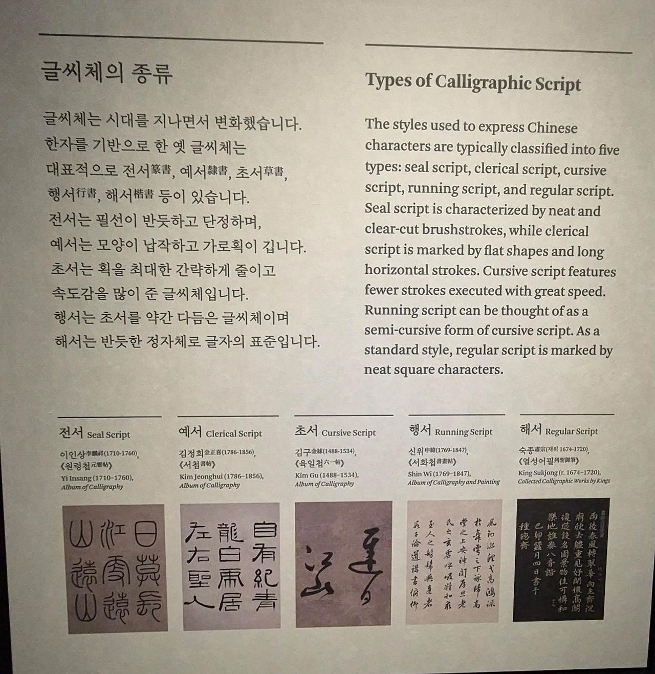 예로부터 '서여기인書如其人'이라 하여 글씨는 그 사람 됨과 같다고 하였다. 그래서 글씨를 쓰고 익히는 일은 문인이나 학자에게 학문과 인격을 닦는 과정이었다. 이들 가운데 타고난 자질과 오랜 수련을 거쳐 빼어난 경지를 이룬 명필이 있다. 우리나라에서는 통일신라의 김생金生을 비롯하여 고려시대의 탄연坦然, 조선시대의 안평대군安平大君과 한호 韓濩 김정희金正喜 등 시대마다 많은 명필이 나왔다. 조선시대에는 왕들도 글씨를 많이 남겼다. 왕이 친히 쓴 글씨는 어필御筆이라 하는데 보배롭게 여겨지고 소중하게 간직하었다.