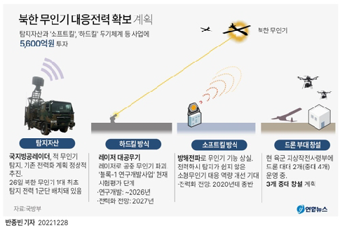 국방부는 탐지자산과 무인기 무력화 무기체계 사업에 5500억 원을 투자할 계획입니다. 레이저를 쏴 무인기를 파괴하거나 방해 전파를 쏴 기능을 못하게 하는 대응 체계도 있습니다. 드론부대도 창설한다고 합니다.