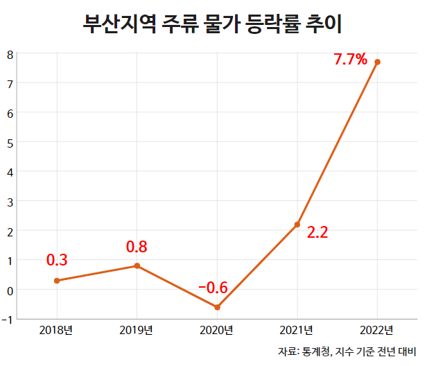 통계청에 따르면 지난해 부산지역 주류 물가 지수는 110.02(2020년= 100)로 전년보다 7.7% 급등했습니다. 이는 외환위기 직후인 1998년(11.3%) 이후 24년 만에 가장 높은 상승률을 기록했죠. 2021년 주류 물가가 전년보다 2.2% 올랐다는 점을 고려할 때 상승률이 3.5배나 높아진 셈입니다. 주종별로는 소주(13.3%) 맥주(6.0%) 막걸리(7.9%) 양주(4.7%) 약주(3.5%) 과실주(0.1%) 등 모든 종류의 술의 가격이 1년 전에 비해 올랐습니다. 전국 주류 물가도 5.7% 오르며 1998년(11.5%) 이후 최고치를 기록했습니다.