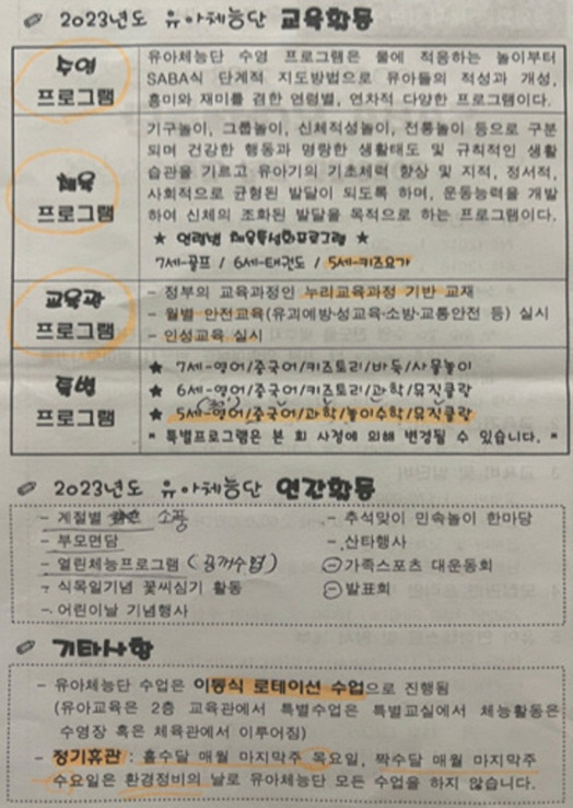 내년 2월 보수에 들어갈 생활관은 최근 정밀안전진단에서 시설물 전체는 C 등급, 일부 시설은 D 등급을 받아 1년 이내 보수 공사를 해야 합니다. 보수 기간은 1, 2년 정도 걸릴 전망입니다. 문제는 이 기간 유아체능단 운영도 중지되고 내년 5, 6세 반(100명) 아동은 졸지에 갈 곳을 잃게 됩니다. 유아체능단은 수영 같은 프로그램뿐만 아니라 일반 유치원에서 이뤄지는 교육과정도 일부 진행한다고 합니다. 때문에 학부모에게 유치원과 마찬가지로 여기고 있습니다.