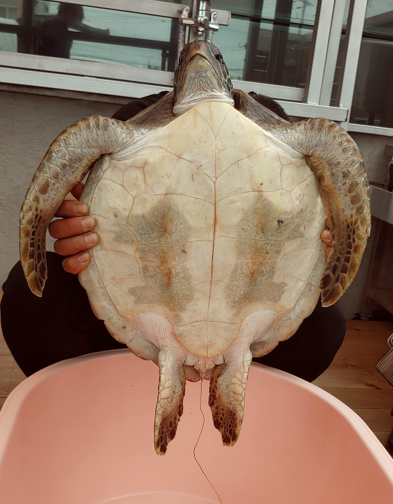 지난 4일 국제적인 멸종위기종으로 분류되는 푸른바다거북 '대한이'가 낚싯줄에 몸통이 관통된 채 발견됐습니다. 제주 서귀포시 운진항 인근 수심 16m 수중에서 다이빙을 하던 잠수부가 폐그물에 걸려 발버둥 치던 어린 거북이를 발견해 구조했습니다. 몸길이 42㎝인 서너 살로 추정되는 새끼 거북이었죠. 대한이의 꼬리 쪽에서는 낚싯줄이 길게 빠져나온 것을 볼 수 있었습니다. 버려진 낚싯바늘에 걸린 물고기를 먹었다가 낚싯줄이 몸속을 관통해 항문으로 빠져나왔습니다. 대한이는 결국 지난 7일 세상을 떠나고 말았습니다.