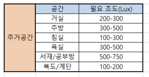 거실, 침실... 등 공간마다 필요한 빛의 강도(조도:lux)가 다르고, 따라서 각 공간의 크기에 따라 필요한 빛의 양(루멘:lumen)도 각각 계산해야 한다. 예를 들면, 거실에 적당한 빛의 강도는 200~300lx이고, 우리 집 거실은 23m2. 따라서 우리 집 거실에 필요한 총 루멘 값은 4600lm+@ 인 식이다. 그다음 우리 집 기준 조명의 루멘값을 계산해 보고 (3인치 다운라이트: 8w였고, w당 90lm이라 했는데 전력효율을 감안 조명 한 개당 600lm으로 계산) 공간 당 필요한 조명의 개수를 계산했다. (4600 lm+@ / 600lm = 거실에 약 8개) 따로 스위치를 넣을 포인트 조명은 계산에 넣지 않고 따로 달았다.