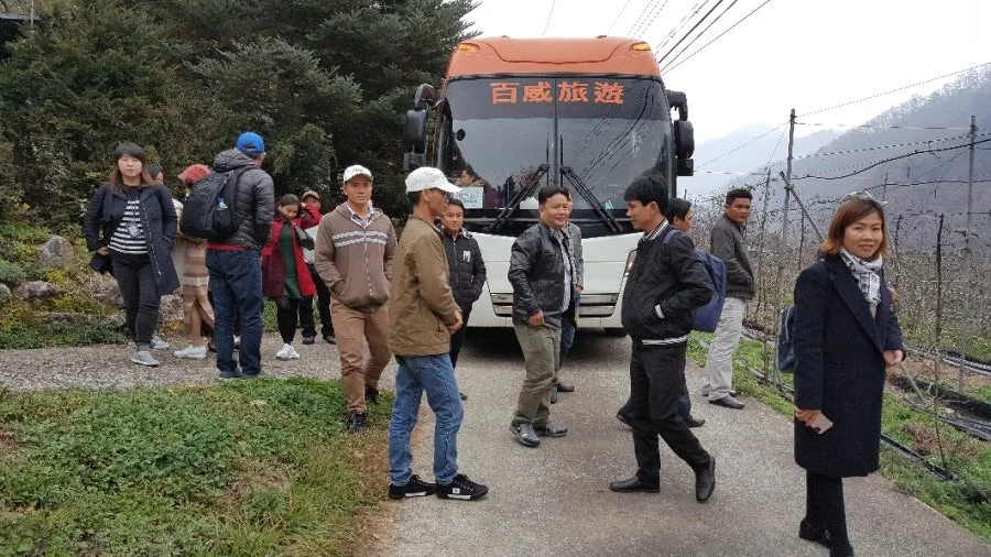 약속 날짜에, 베트남 관광객들이 대형버스를 타고 왔다.