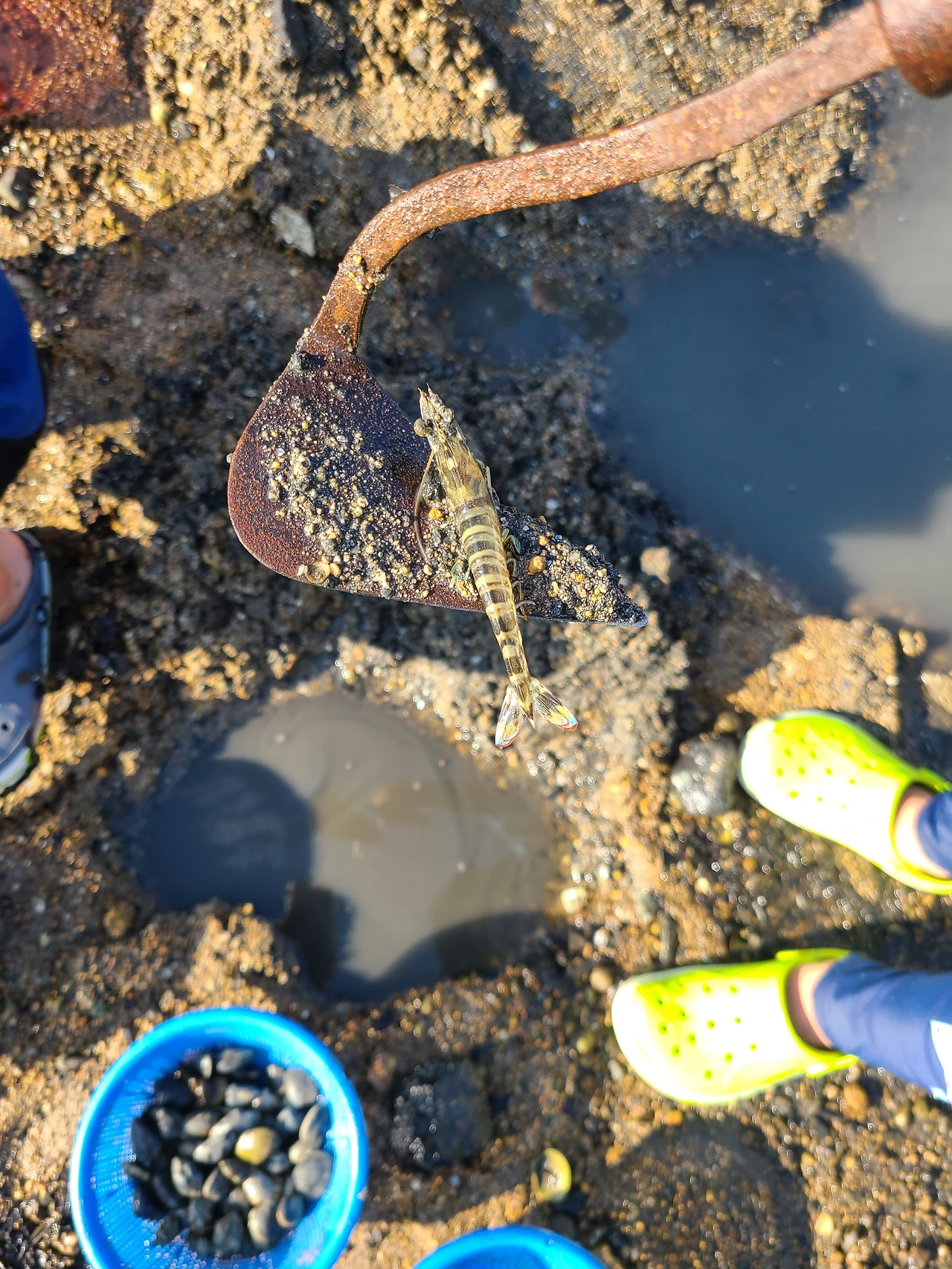 갯벌에 있는 것은 바지락뿐만이 아니었다. 소라게와 골뱅이 등 다른 생명들도 있었지만, 그중에 으뜸은 단연 꽃게와 오도리 새우였다. 꽃게는 돌덩이를 들추면 그 아래에 있었지만, 오도리 새우는 바지락 캔다고 흙을 팠을 때 그 흙 속에서 나왔단다. 생각지도 못 하게 새우를 잡은 큰 아이는 신이 났다.