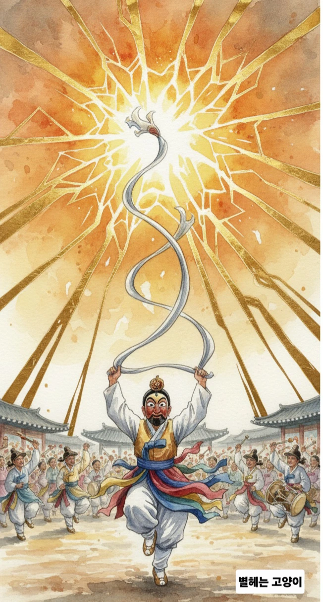 꽹과리 따라, 손끝 긴 장수건 , 하늘이 한껏 열리네.