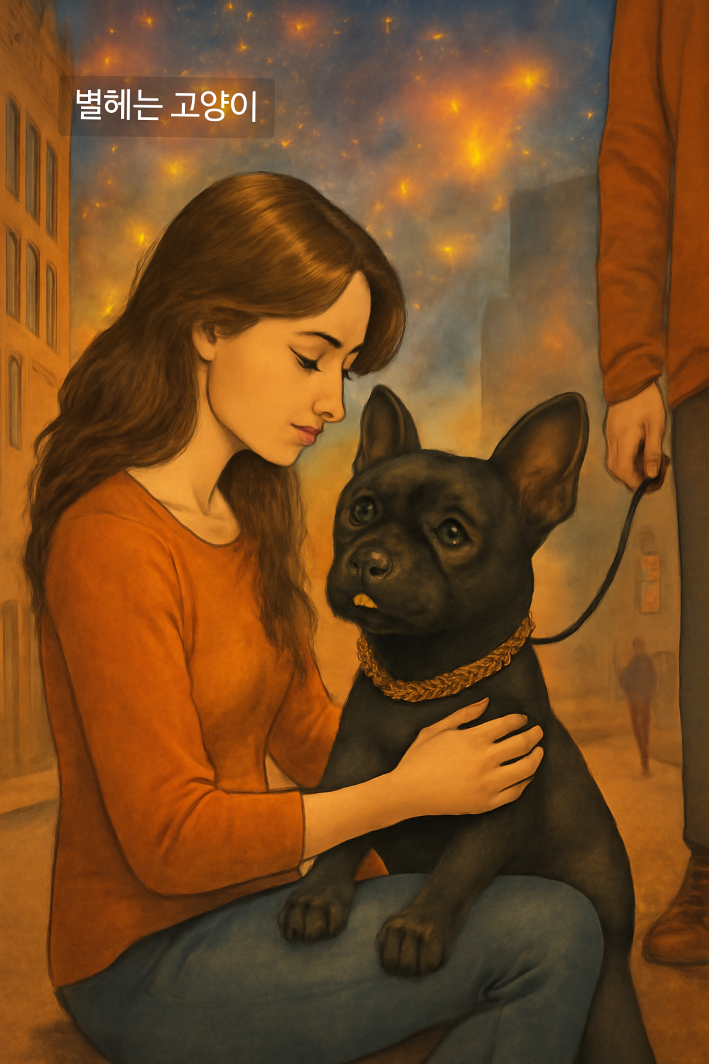 금빛 목걸이를 한 작고 검은 프렌치불독,