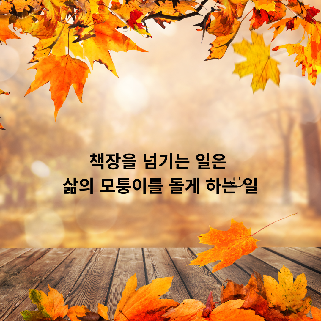 어쩌면 책을 사랑하는 마음만큼은 계절을 사랑하는 마음처럼 크고 깊어 어디서든 나를 위로해 주기 때문일 것이다. 가을빛으로 물든 길을 걷다 보면 골목마다 새로운 이야기가 숨어 있는 듯 길모퉁이에서 마주치는 인연처럼 가을빛 속에서도 또 어떤 사람이, 어떤 이야기가 나를 기다리고 있을까 궁금해진다. 그렇게 책과 사람과 계절은 서로의 빈자리를 채우며 이어진다.