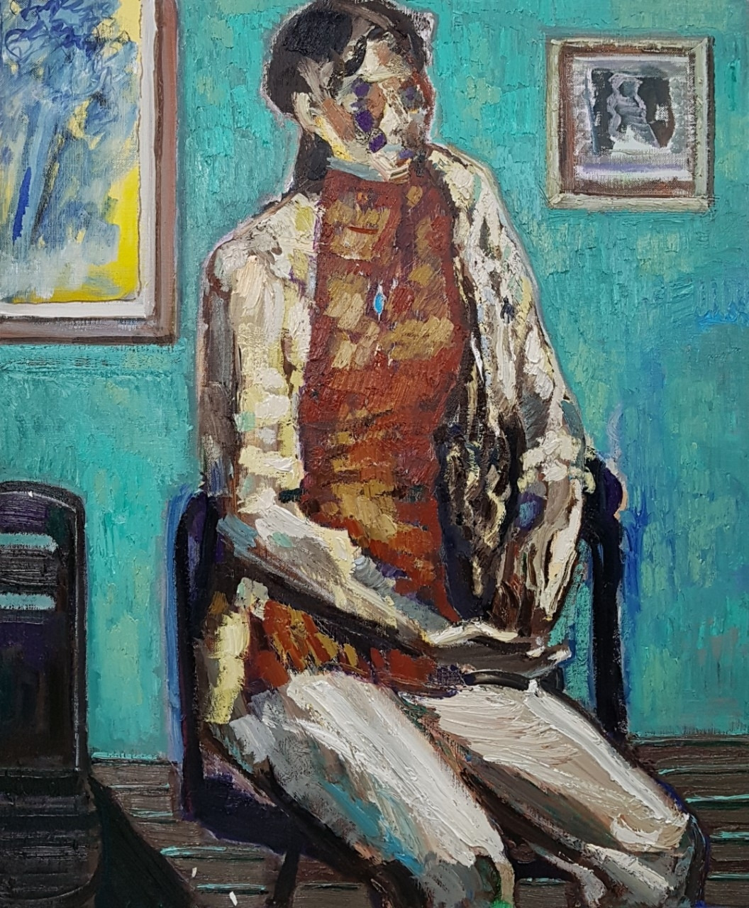 인물 옆 빈 의자가 주는 ‘부재(不在)’의 공허함이 어둡고 무겁다. 표정을 짐작할 수 없는 얼굴에서 불안을 본다. 가슴 한 복판에서 반짝이는 ‘푸른’ 빛이 그나마 위안이다.