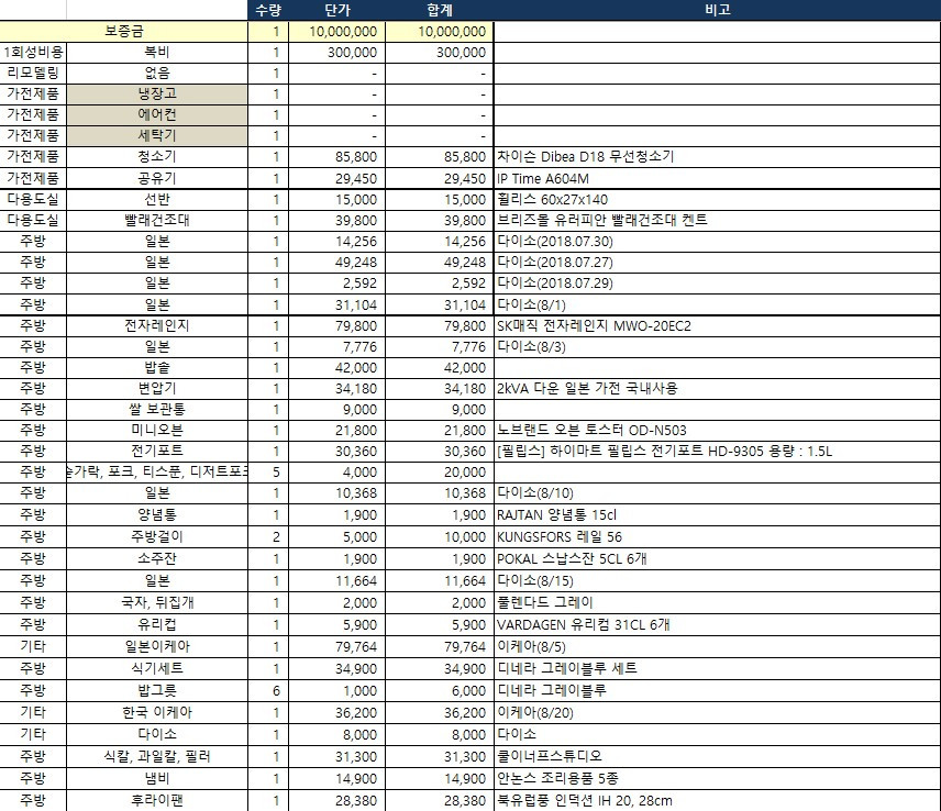 구매목록을 작성한 후 먼저 각 공간의 특성에 맞게 구역을 나눠 필요한 물품들을 정리해 보았습니다. 제가 사는 집이라면 살면서 천천히 필요한 물품들을 구매하면 되었지만, 한국으로 유학을 오는 학생들이 사용할 공간이었기에 처음부터 불편함이나 부족함이 있으면 안 된다고 생각을 하였습니다. 무료 봉사활동도 아니고 정당한 대가를 받고 공간을 빌려주는 것이니 완벽하게 준비하고 싶은 마음에 하나도 빠뜨리지 않게 하기 위해서 많은 노력을 하였습니다. 돌이켜보면 신혼집을 준비할 때보다 더 열심히 준비한 것 같습니다.