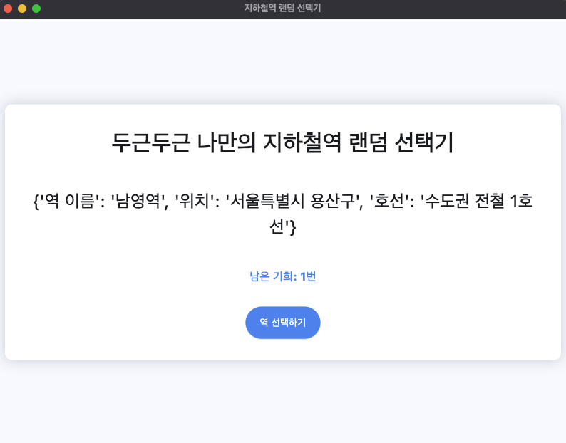 그래서 회사에서 같이 일하시는 분이 만들어주신 랜덤 지하철 선택기를 돌려서 나온 역으로 출사를 다녀와야겠다고 생각해서 돌려봤다 감사합니다