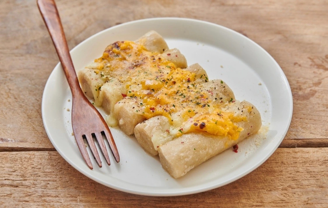 재료 (엄마떡집) 현미곤약 가래떡 2줄, 체다치즈 1장, 모차렐라 치즈 2큰술, 파슬리·연유·파르메산 치즈 가루 약간씩