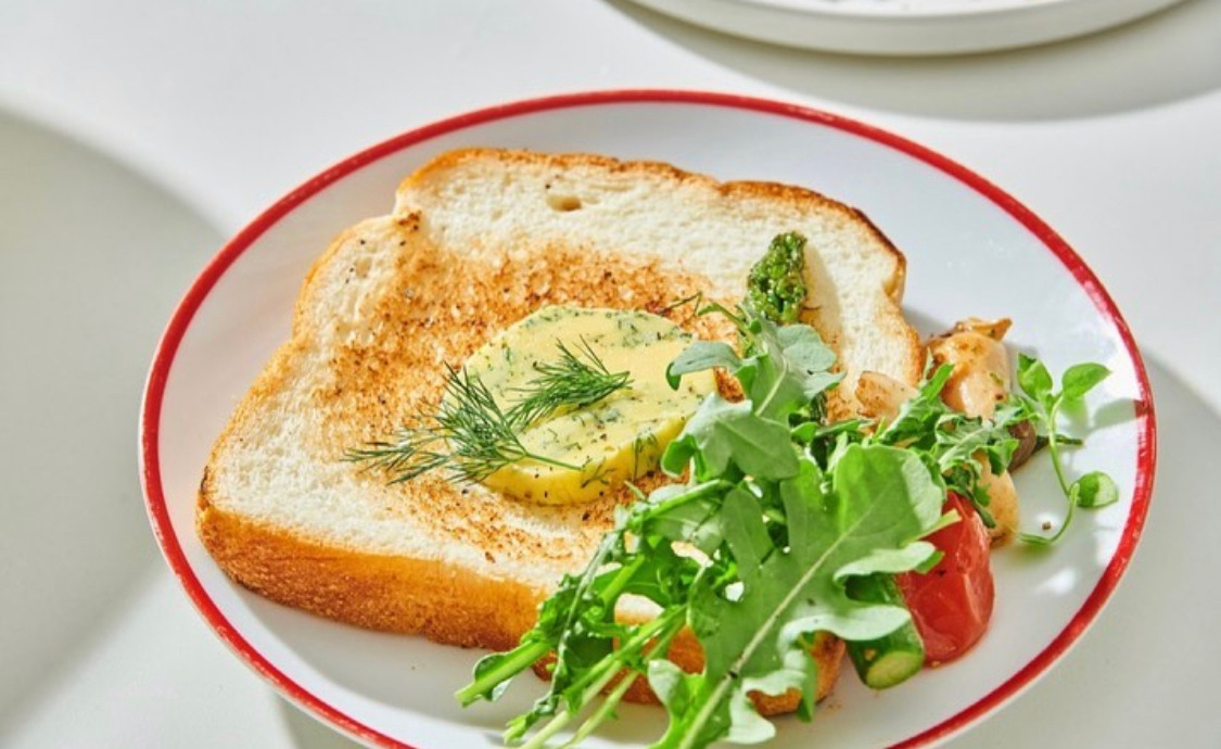 음식의 색감이 다채로운 만큼 그릇은 비비드한 무늬나 선으로 포인트를 준 심플한 것을 선택한다. 먼저 바삭하게 구운 빵과 자른 버터 한 조각을 그릇에 올린다.