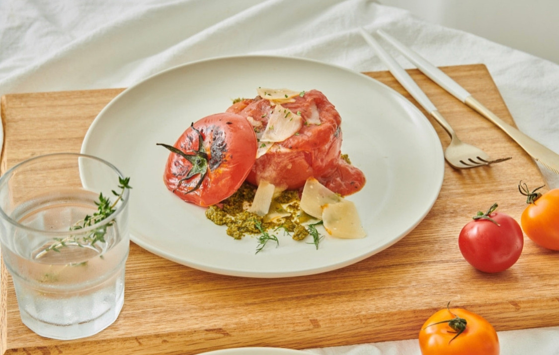 전 세계에서 나는 토마토는 500여 종에 달한다. 우리가 아는 것만 해도 찰토마토, 흑토마토, 대저토마토, 스테비아토마토, 방울토마토, 대추토마토 등 다양해 취향대로 즐길 수 있다. 토마토를 활용한 레시피 또한 셀 수 없이 많다. 오늘 소개할 요리는 프랑스 가정식 ‘토마토 파르시(Tomato farci)’다. 파르시는 ‘다진 고기와 채소 등으로 속을 채운 것’을 의미하는 프랑스어다. 누구나 손쉽게 만들어 먹을 수 있도록 속 재료는 완제품인 ‘콩고기 라구소스’를 활용하려 한다. 속을 채운 토마토 위에 치즈를 듬뿍 올려 에어프라이어에 구우면 간단하면서 건강에도 좋은 음식을 만들 수 있다. 닭가슴살, 캔참치 등을 활용해도 좋다.