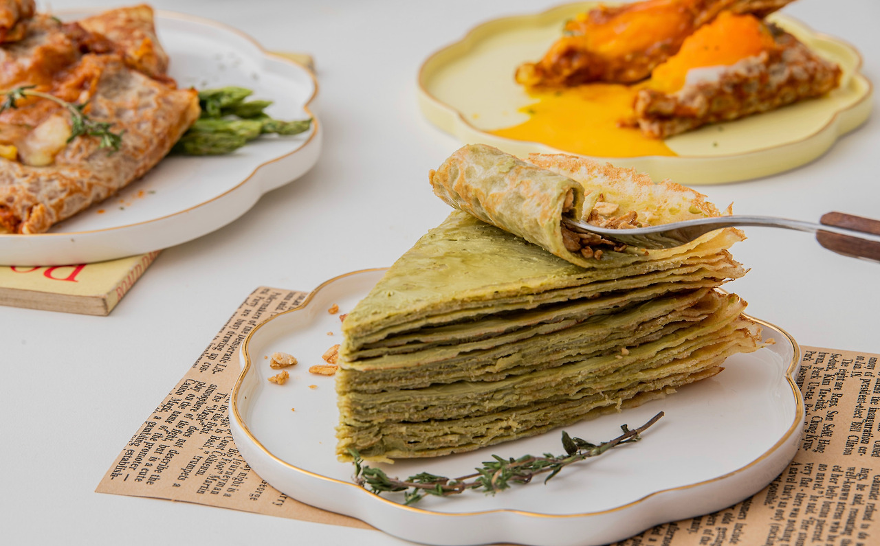 브런치는 맛만큼 담음새도 중요하다. 크레페를 담을 접시는 원형이나 타원형이 적당하다. 어두운 계열보다 밝은 계열이 좋고, 테두리 라인에 색감이 들어간 디자인을 선택하면 입체감과 포인트를 줄 수 있다. 테이블에 올릴 때 그릇 밑에 영자신문을 깔아두면 별다른 소품 없이도 특별한 느낌을 살릴 수 있다.
