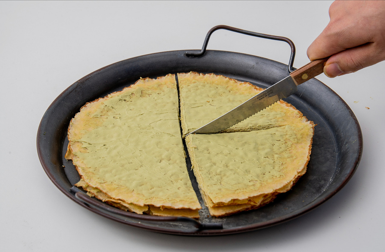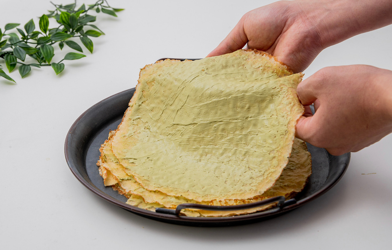 2. 1의 과정을 반복해 크레페를 쌓아 올린 뒤 4등분으로 잘라 한 조각 위에 나머지 세조각을 올린다.