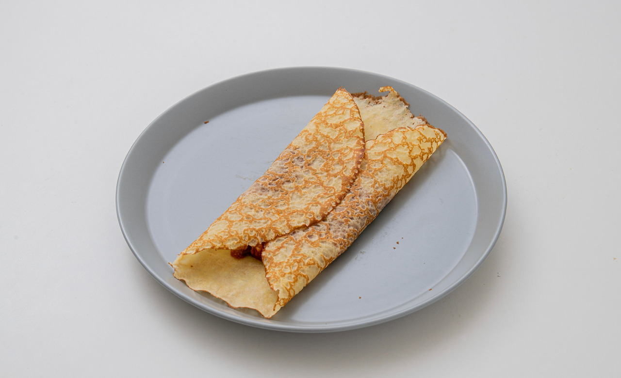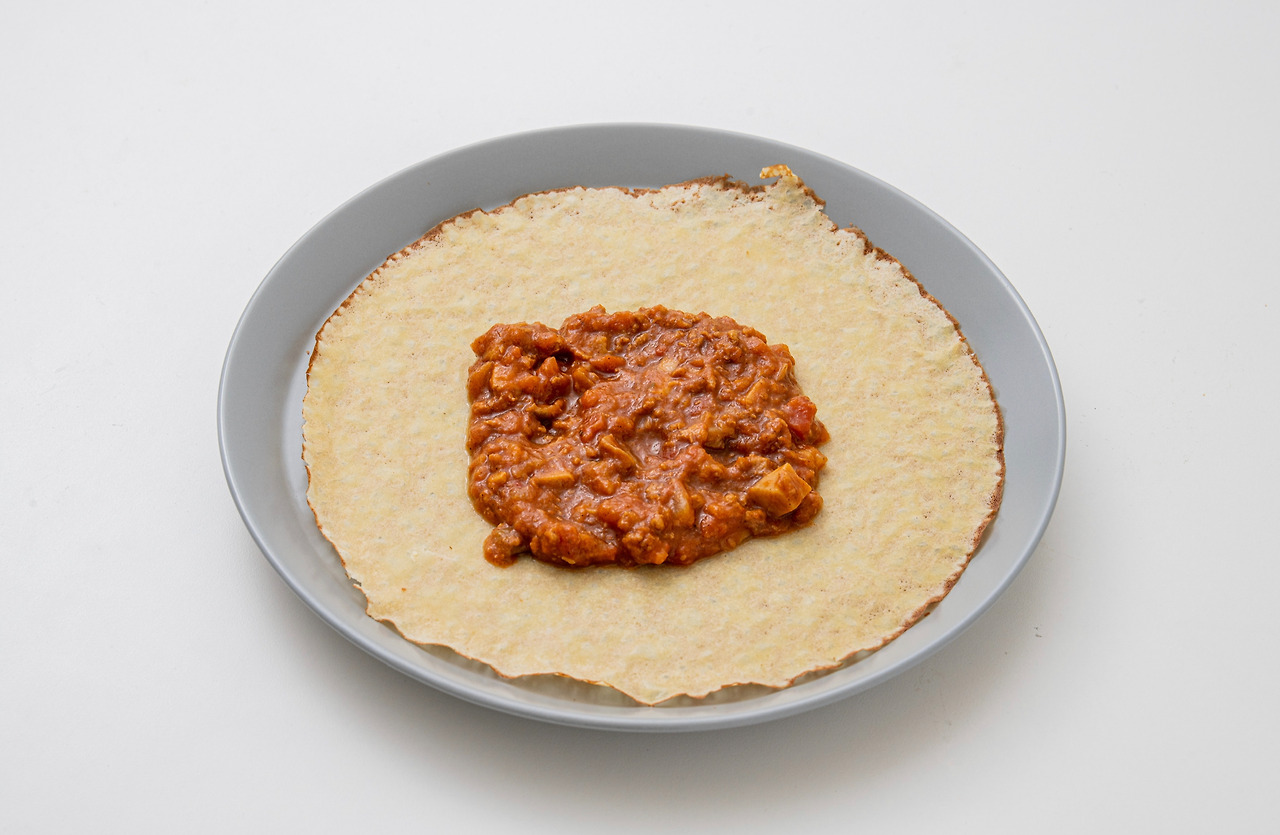1. 크레페 한 장을 도마에 깐다. 라구 소스를 크레페 가운데 듬뿍 올린 뒤 옆면을 접고 크레페를 말아준다.