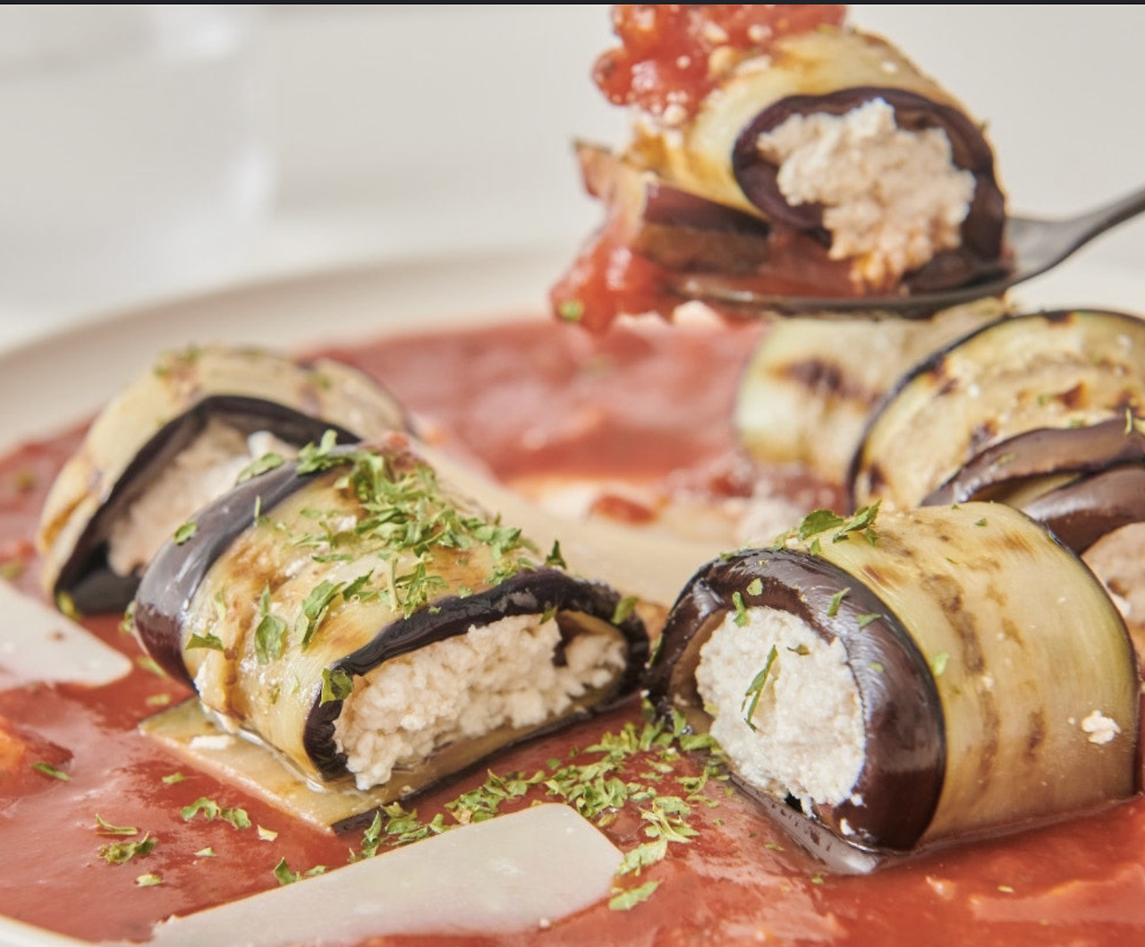 3 구운 가지에 리코타 치즈를 올려 돌돌 만다. 4 타원형 접시에 토마토 소스를 뿌린 다음 가지롤을 가지런히 올리고, 파슬리 가루를 뿌려 마무리한다. 5 탄산 가득한 콤부차에 레몬, 로즈메리를 넣어 함께 페어링한다.