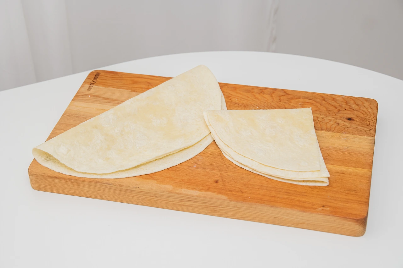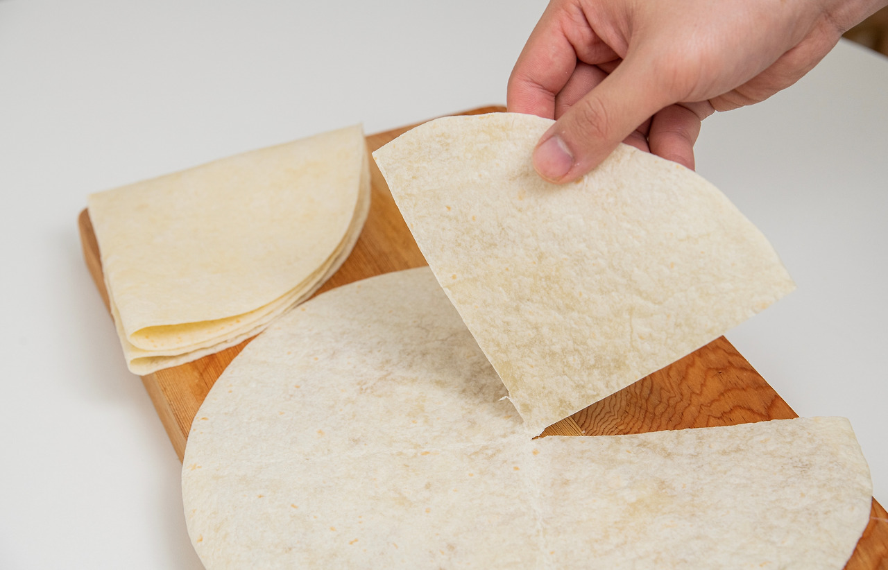 1 토르티야를 반으로 접고, 그걸 다시 접는다. 접은 토르티야를 펴면 4등분의 선이 생긴다. 그중 한 선을 가위로 자른다.