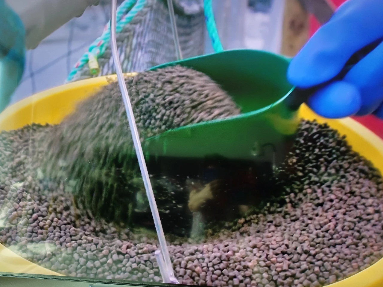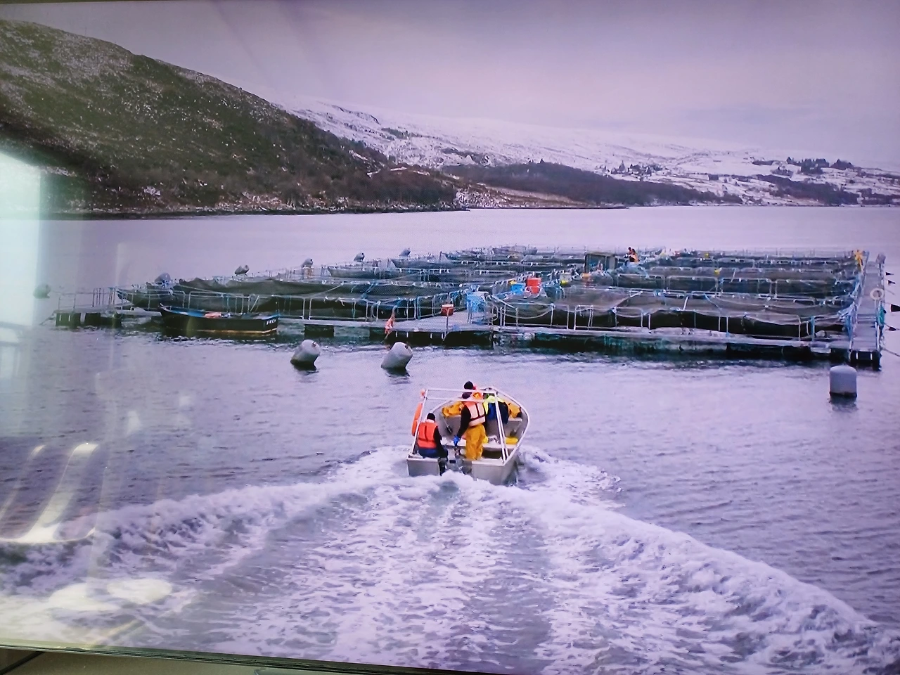 동료들과 함께 15만 마리의 연어에게 매일 사료를 주고 그물을 올리고 내리는 일을 한다.