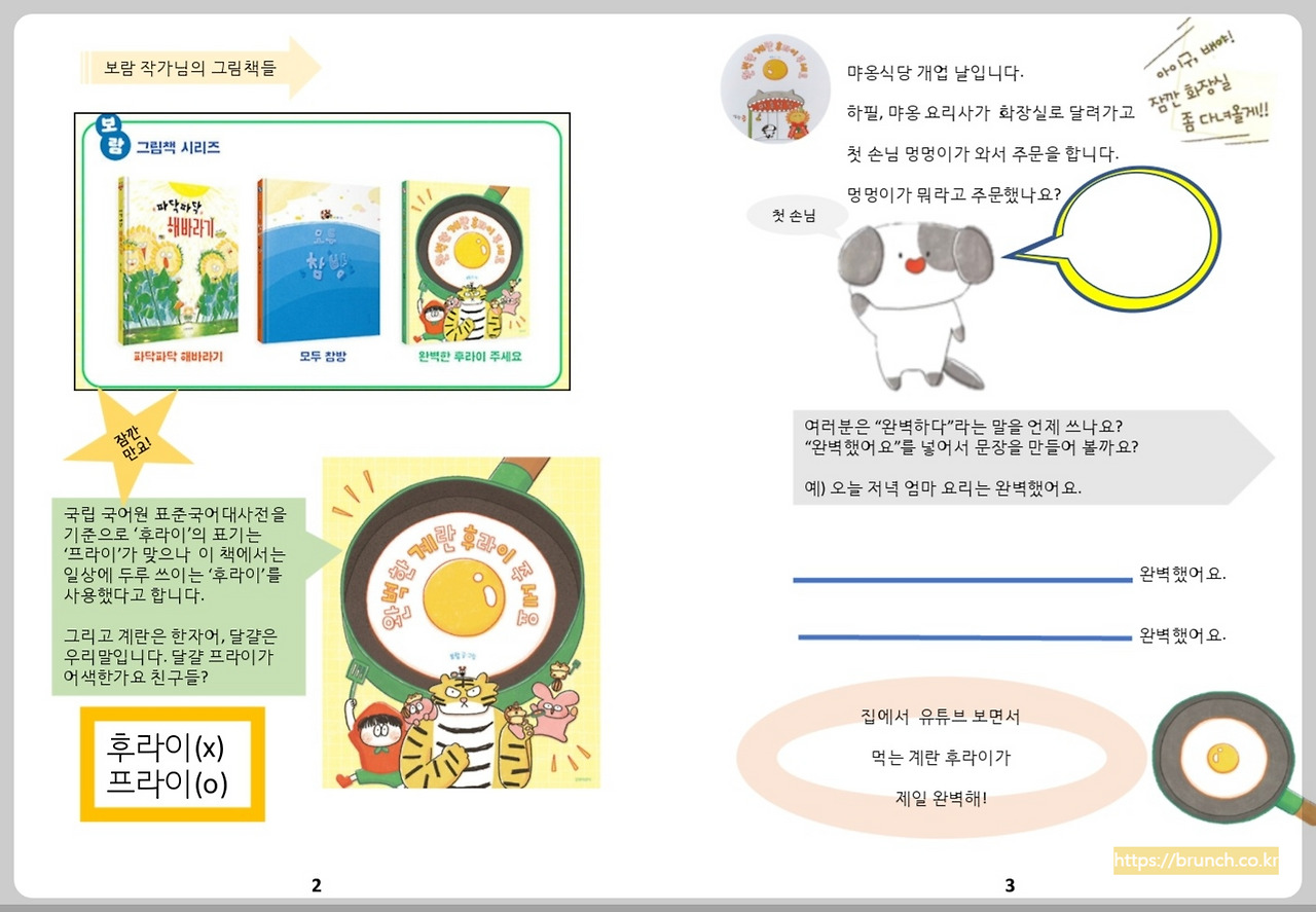 이 책을 앞에 두고 고민이 많았다. '후라이'가 바른 표기가 아니기 때문이다. 오래전 나온 책 '짜장 짬뽕 탕수육'(김영주 작가님 글/ 2012)도 그때 당시 짜장은 자장이 바른 표기였는데 글의 맛을 살려 짜장으로 표기했다. 하지만 지금은 짜장도 표준말이다. 향후 프라이와 후라이 모두 바른 표기로 인정되지 않을까 예상해 본다. (사실 나도 맞춤법, 특히 띄어쓰기에 약하다. 카카오브런치에서는 맞춤법 검사가 있어 너무 좋다.)