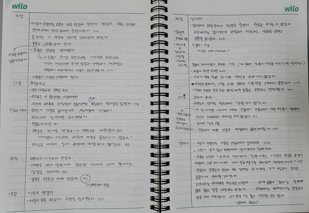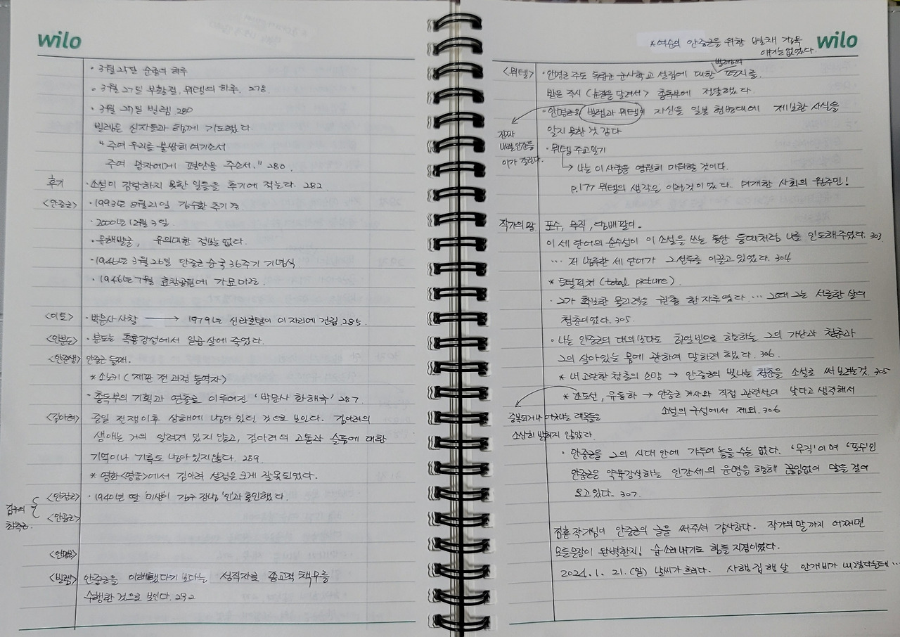 마지막으로 작가의 말은 대단한 명문이었다. 김훈 작가님 문장을 내가 여기서 대단하다 말하는 일조차 시간 낭비다. 안개비 내리던 1910년 3월 26일까지의 안중근 의사의 행적을 우리는 이 책을 통해 만날 수 있다. 나는 김훈 작가님께 감사의 마음을 담아 노트 정리하며 각 챕터에 제목을 지으며 읽었다. 이렇게 나의 대련 여행도 비로소 끝이 났다.