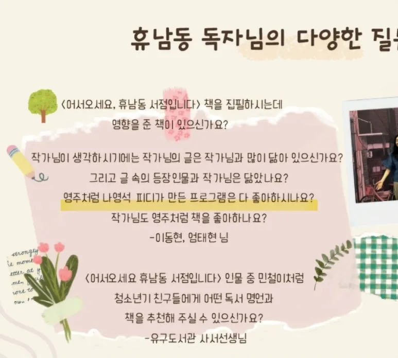 휴남동 서점에 소개된 여러 책들을 모두 읽어보겠다는 중학생 독자들의 다짐이 진행을 맡았던 저까지 뿌듯하게 했습니다.