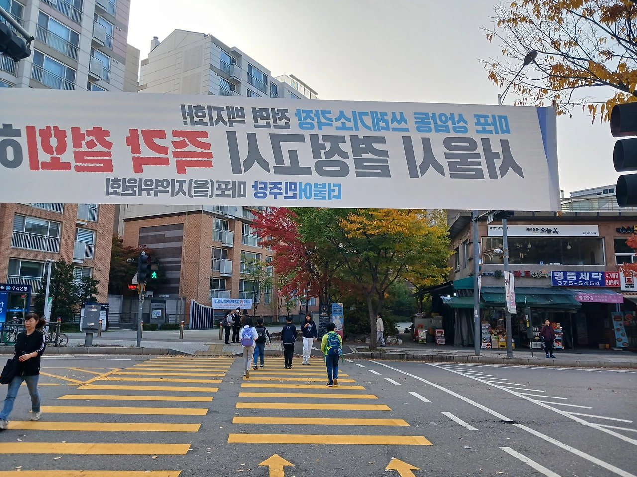 횡단보도 앞에서 신호를 기다리며 수다를 떠는 아이들 머리 위로 걸게 하나가 걸려 있다.