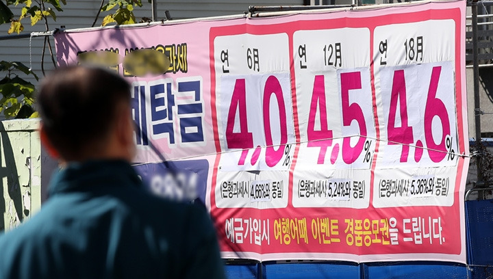 신규취급액 기준으로 지난해 1월 1.64%였던 예금 금리가 11월엔 4.30%까지 상승했다. 불과 10개월 만에 정기예금의 금리가 1%대에서 4%대로 3%포인트 가까이 치솟은 것이다. 주식과 부동산 시장 침체로 갈 곳을 잃은 시중 자금이 가장 높고 안정적인 수익을 기대할 수 있는 은행권으로 빠르게 흡수된 셈이다.