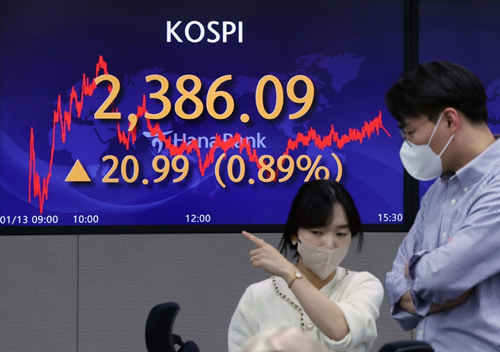 13일 오전 9시 4분 전 거래일보다 19.79포인트(0.84%) 오른 2384.89을 기록했던 코스피는 이날 전날보다 20.99포인트(0.89%) 오른 2386.09에 거래를 마쳤다. 종가기준으로 2380선을 넘어선 것은 지난달 14일(2399.25) 이후 한달여 만이다. 외환시장에서 원·달러 환율은 전날보다 4.5원 내린 달러당 1241.3원에 마감했다.
