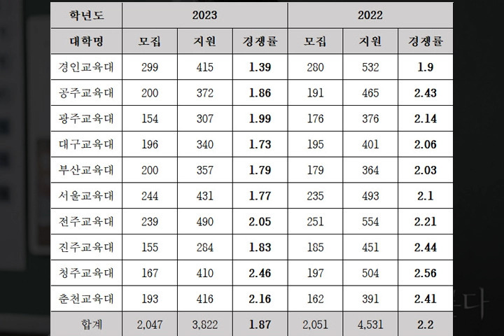 이처럼 최근 교대 경쟁률이 점점 하락하며 위의 케이스처럼 기이한 현상이 종종 발생하고 있다. 입시업계에 따르면 2023학년도 전국 10개 교대 평균 경쟁률은 1.87 대 1로 지난해인 2.2 대 1에 비해 크게 하락했다.