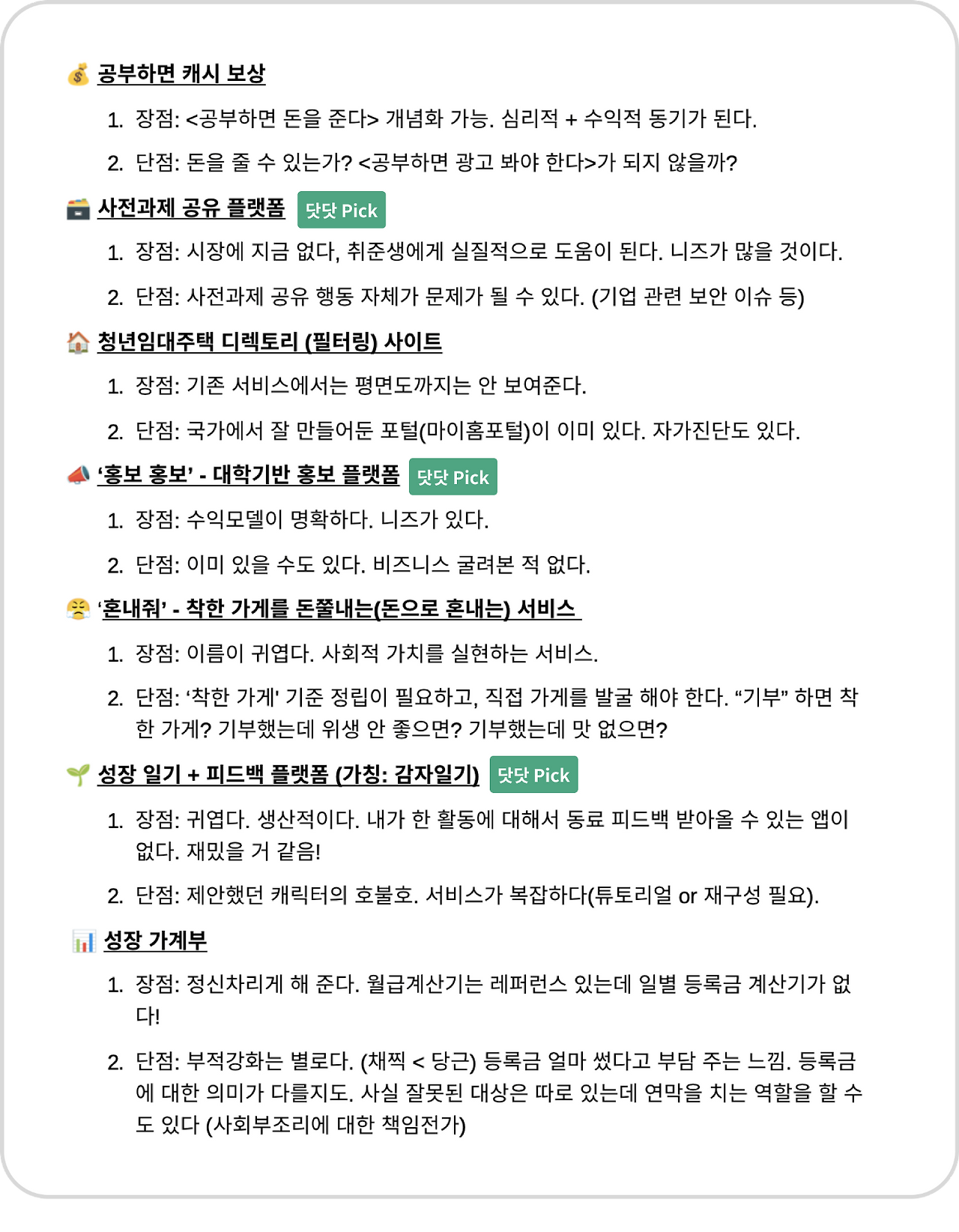 조금 더 찾아보니 자료를 모으기 위한 공수가 많이 든다거나, 플랫폼 형태는 아니지만 이미 다른 방식으로 상용화된 경우를 하나씩 발견하고 … 이것저것 따져본 결과 “성장일기&피드백 플랫폼”이 최종 아이템으로 채택되었답니다. 아무래도 팀 닷닷은 성장에 목마른 사람들이기 때문이 아닐까 싶었어요.