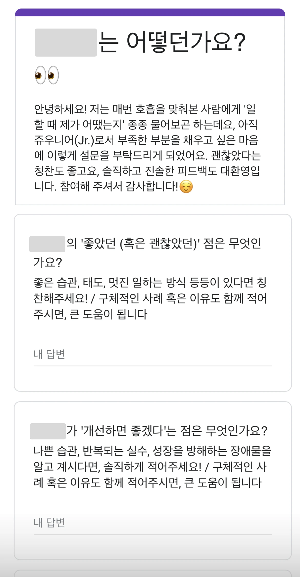 그래서 당시 이런 구글 폼(설문조사)을 돌렸답니다. 이후로는 같이 한 팀이 되어 일했던 사람들에게는 꾸준히 의견을 요청하고 저를 트래킹하고 있어요. 실제로 사용해 보면 기분을 한껏 두둥실 떠오르게 할만한 칭찬을 받기도 하구요, 뼈가 되고 살이 될만한 인사이트도 발견하게 됩니다. 익명이지만 다들 저를 아껴주는 마음에서 좋은 피드백을 많이 남겨주시더라고요.
