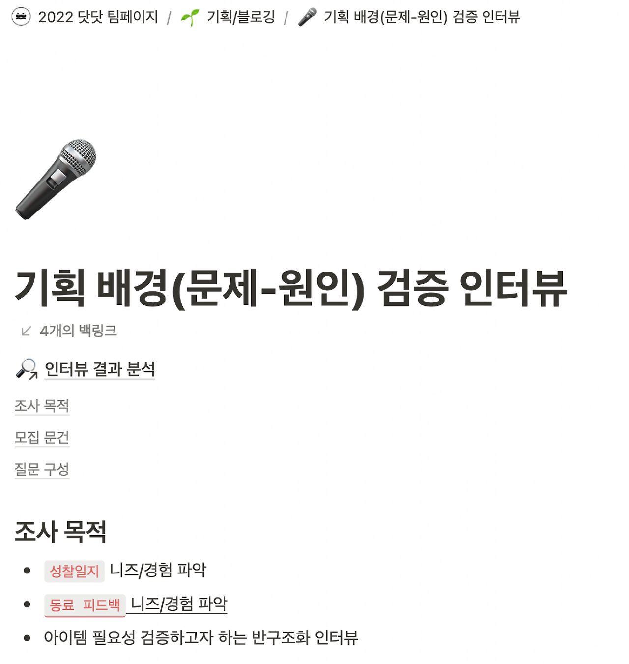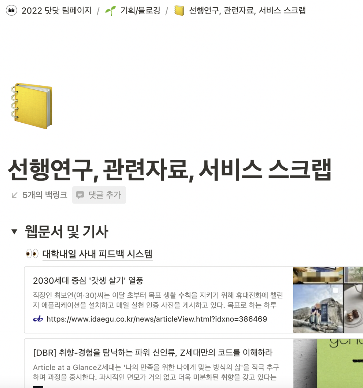 이렇게 자료를 수집해서 배치하는 과정이 곧 아이템 제작 필요성 설득을 위한 로직을 만드는 과정이 되는 것이겠죠. 저의 경우 팀페이지로 쓰는 노션에 각종 자료를 스크랩하고 내용을 정리하는 방식으로 데스크리서치를 먼저 수행했어요. 그 내용이 지난 포스팅에 언급된 바 있지요. 이어 ‘성장 추구형 인간’들의 경험을 좀 더 구체적으로 파악하고, 문제상황 검증 겸 아이템에 대한 생각도 물어봐야겠다 싶어 인터뷰를 계획했습니다. “회고록을 작성해 본 경험이 있으신 분”, “수업 외의 ‘팀 단위’ 프로젝트를 꾸준히 찾거나 추진해 오셨던 분” 등을 찾는다고 명시한 인터뷰 모집 문건을 주변에 돌리고 7명(22세~25세) 대상의 비대면 반구조화 인터뷰를 진행할 수 있었어요.