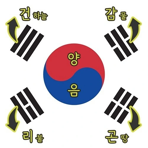 가운데 위치한 빨간색과 파란색의 태극문양이 바로 음과 양을 의미한다. 그리고 음과 양을 가르는 물결모양은 바로 음과 양의 상호 순환을 의미한다. 빨간색이 가장 많은 부분이 양이 가장 가득 찬 것을 의미하고, 파란색이 가장 많은 부분이 음이 가장 가득 찬 것을 의미한다. 달이 차면 기울고, 해가 뜨면 지고, 사계절이 순환하듯 양의 기운이 가득 찬 후에는 음의 기운이 강해지고 그 반대의 경우도 같다. 결국 음과 양은 서로 대체하고 배척하는 것이 아니라 순환하고 상호 보완하는 존재인 것이다. ‘너무 세면 부러진다.’, ‘고이면 썩는다.’ 이런 말들은 참으로 맞는 말인 것이다. 우리는 항상 비우면 채우고, 채우면 비우며 한 기운이 너무 강해지지 않게 순환하는 삶을 살아야 하는 것이다.