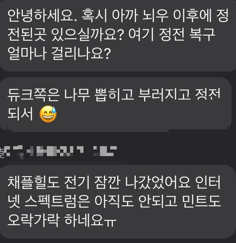 하지만 중계기 등은 다 고장을 일으켰는지 한동안 인터넷 와이파이 신호가 약하게 잡히고, 어디 갈 때마다 아예 핸드폰 통신 서비스가 먹통이 되는 등 꽤 불편했던 기억이 난다. (어제 일로 지금도 핸드폰 화면에 5G가 LTE나 ‘서비스 없음’으로 바뀌고 평소보다 훨씬 신호가 약하게 표시되고 있다)